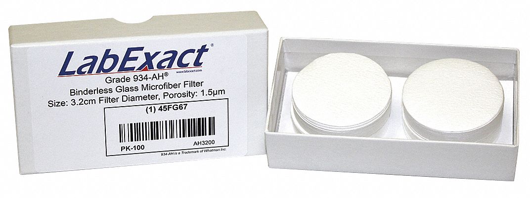 ' Glass Microfiber Filter, Grade 934-AH, Diameter 32mm, Material Borosilicate Glass, Thickness 0.43mm, Temp. Range Up to 550 Degrees C, For Use With Volatile Suspended Solids, Total Suspended Solids In Water, Removal of Turbidity and Filtration of Bacterial Cultures, Laboratory Applications, Water Pollution Monitoring, Cell Harvesting, Liquid Scintillation Counting and Air Pollution Monitoring, Package Quantity 100 '