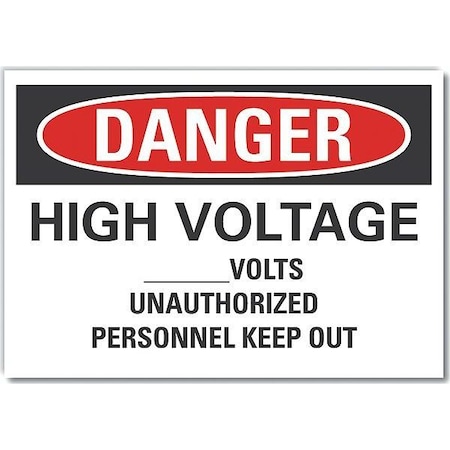 Danger Sign, Vertical Rectangle, Number of Printed Sides 1, English, Sign Format Traditional OSHA, Sign Legend High Voltage ___Volts Unauthorized Personnel Keep Out, Sign Legend Background Color White, Sign Legend Style Text
