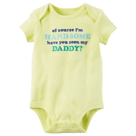With a sweet slogan and expandable shoulders, this babysoft cotton bodysuit pairs perfectly with cozy pull-on pants for quick changes and easy outfits. -- Short sleeves -- Nickel-free snaps on reinforced panel -- Expandable shoulders -- Embroidered "OF COURSE I'M HANDSOME HAVE YOU SEEN MY DADDY?" slogan