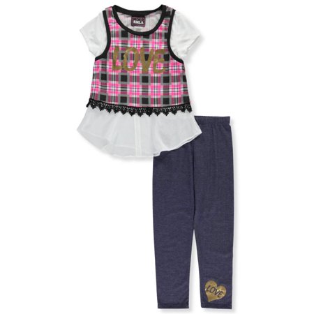 Give your girl a stylish layered look with this RMLA 2-piece! <ul> <li>RMLA 2-piece outfit</li> <li>Jersey T-shirt with a plaid tank overlay, metallic chest graphic, contrast rib-knit trim, and chiffon shirttail hem with embroidered trim (60% cotton, 40% polyester)</li> <li>Stretch-knit leggings with metallic graphic at leg and elastic waistband (55% cotton, 40% polyester, 5% spandex)</li> <li>Shirt graphic as shown may vary by color.</li> <li>Machine wash cold, gentle, inside out</li> <li>Imported</li> </ul>