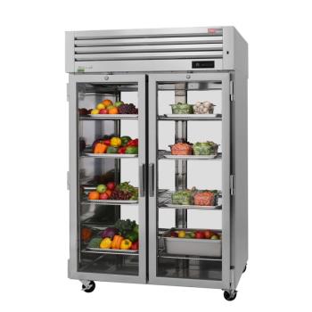 Turbo Air's PRO Series Refrigerator, pass-thru, two-section, 48.7 cu. ft. capacity, 51.75"W x 36.25"D x 78"H, top mount self-contained refrigeration, self-cleaning condenser device, digital temperature controller, self-diagnostic monitoring system, hot gas condensate system, automatic fan motor delays, (2) front glass doors & (2) rear glass doors with locks, lifetime guaranteed heavy duty hinges & handles, LED interior lighting, (6) stainless steel wire shelves, stainless steel interior & exterior (galvanized top & bottom), R290 Hydrocarbon refrigerant, 1/2 HP, 115v/60/1-ph, 8.0 amps, NEMA 5-15P, cETLus, ETL-Sanitation, MADE IN USA (allow 4 week lead time). 4" swivel caster set, locking front wheels, 5"H (overall), standard.