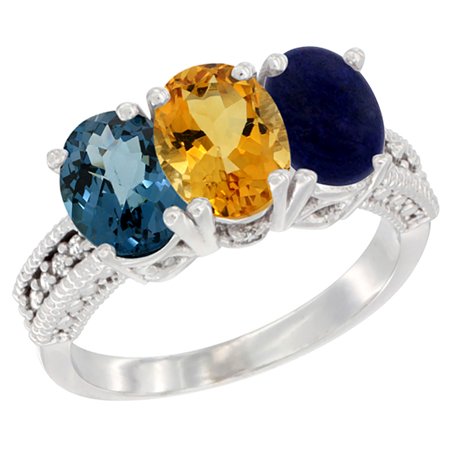 14K White Gold Natural London Blue Topaz, Citrine & Lapis Ring 3-Stone 7x5 mm Oval Diamond Accent, sizes 5 - 10