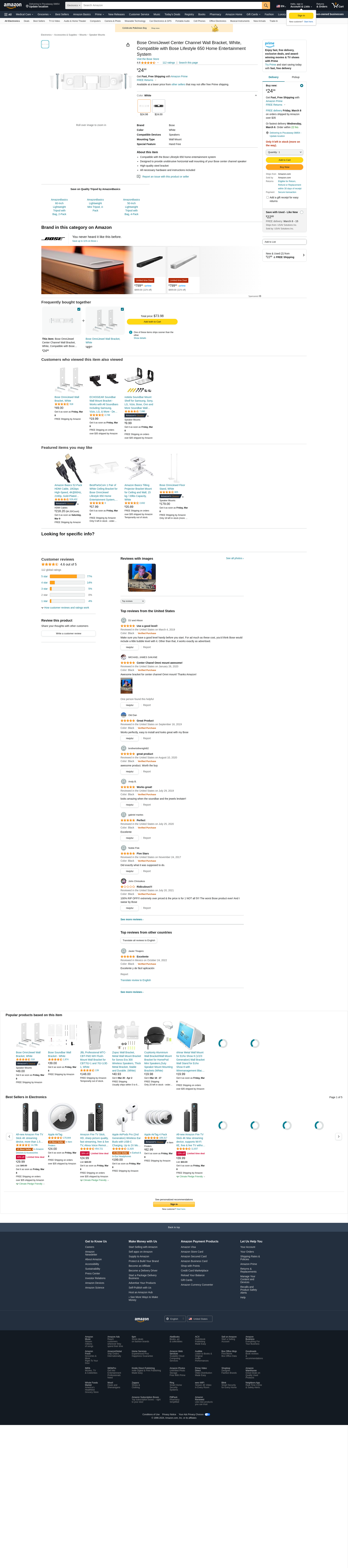 Bose OmniJewel Center Channel Wall Bracket, White, Compatible with Bose Lifestyle 650 Home Entertainment System