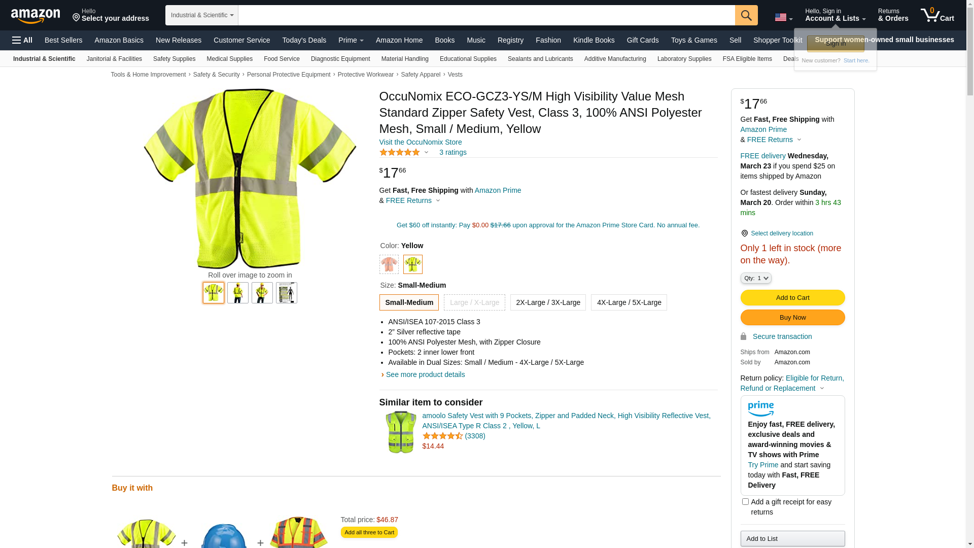 OccuNomix ECO-GCZ3-YS/M High Visibility Value Mesh Standard Zipper Safety Vest, Class 3, 100% ANSI Polyester Mesh, Small / Medium, Yellow
