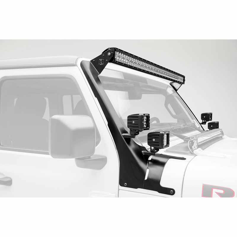 Jeep JL, Gladiator Front Roof LED Bracket to mount (1) 50 or 52 Inch Straight LED Light Bar and (4) 3 Inch LED Pod Lights - PN #Z374831-BK4