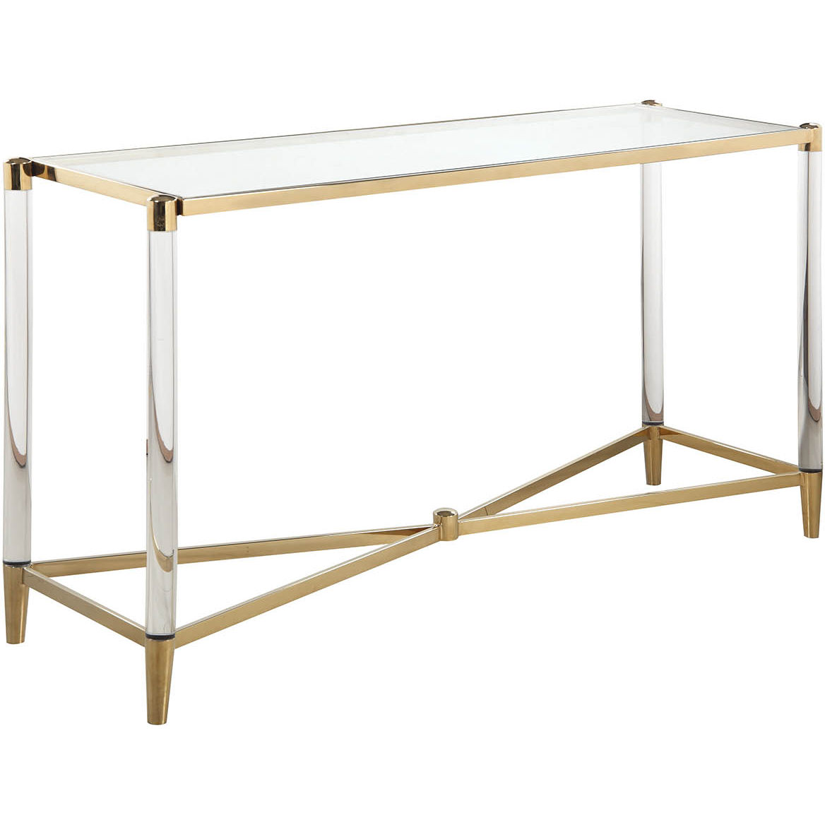 A contemporary sofa table that features a rectangular clear tempered glass top and an X-shaped base along with steel frame with brass finish and acrylic legs.<br/><br/>Features :<br/><br/>- Material: Steel and glass<br/>- Finish: Clear, brass<br/>- Steel frame with brass finish<br/>- Acrylic legs<br/>- Flat polished edge<br/>- X shaped base.<br/><br/>Specifications :<br/><br/>- Product Dimensions : 29.9"H x 52"W x 16"D<br/>- Product Weight : 50.49 lbs.
