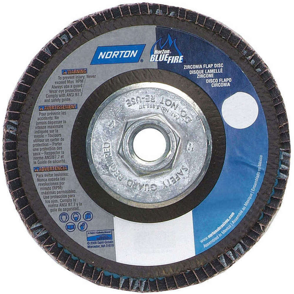 - <b>Price For:</b> Each <b>Abrasive Material</b>: Zirconia Alumina <b>Backing Weight</b>: Y <b>Disc Type</b>: Type 29 <b>Series</b>: Bluefire <b>Backing Material</b>: Fiberglass <b>Abrasive Type</b>: Coated <b>Item</b>: Flap Disc <b>Mounting Size</b>: 5/8-11 <b>Disc Dia.</b>: 7" <b>Max. RPM</b>: 8600 <b>Grit</b>: 60 <b>Grade</b>: Medium <b>Country of Origin (subject to change)</b>: France