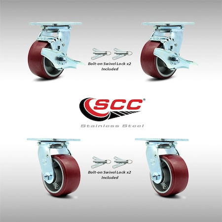 S.S. Poly on Aluminum Swivel Caster w/Main. Free Bearings Set 4 w/4" x 2" Maroon Wheels-Includes 2 Swvl w/BRK and Bolt on Swvl Lcks&2 Swvl w/Bolt on Swvl Lcks-2800lbs Total Cpty - Service Caster Brand