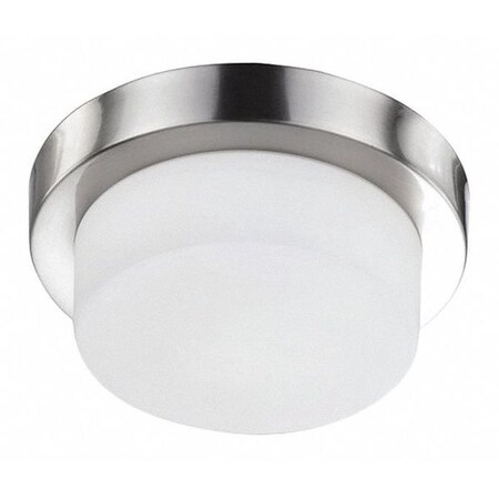 Single LED flush mount ceiling fixture with round white opal glass. Metal details in brushed nickel or chrome finish.