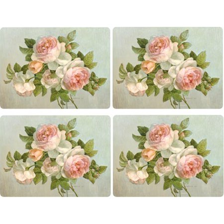 The Pimpernel Antique Rose Set of 4 Placemats are sized 16" x 12" and made of hardboard with a quality cork backing. The mats feature a beautiful Antiqued Rose design and are heat resistant to 212 degrees F and are packaged in a gift box.