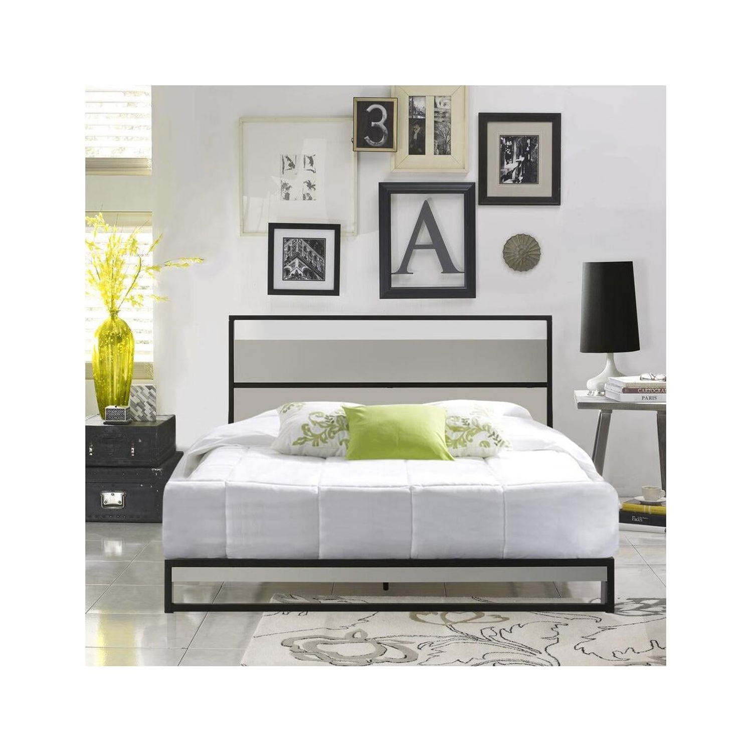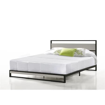 - Features a metal frame and wood inlay headboard; Box spring not required but recommended