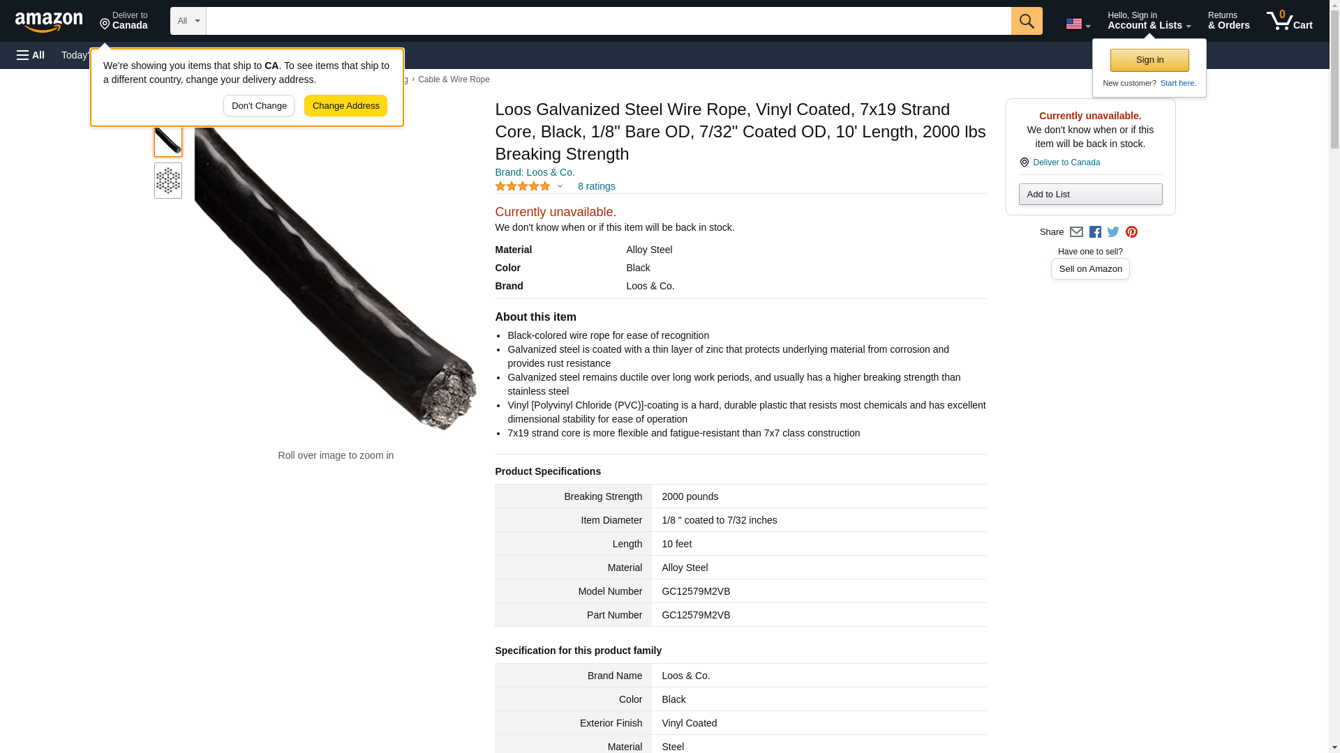 Loos Galvanized Steel Wire Rope, Vinyl Coated, 7x19 Strand Core, Black, 1/8" Bare OD, 7/32" Coated OD, 10' Length, 2000 lbs Breaking Strength