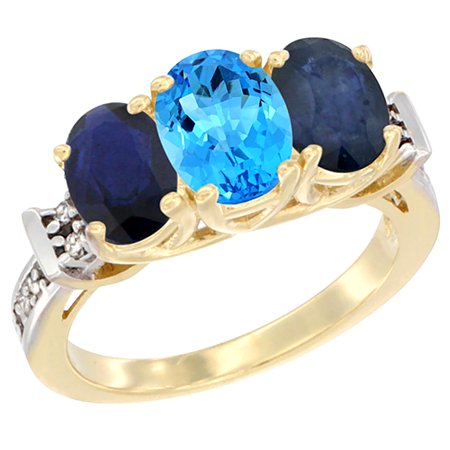 10K Yellow Gold Natural Swiss Blue Topaz & Blue Sapphire Sides Ring 3-Stone Oval Diamond Accent, sizes 5 - 10