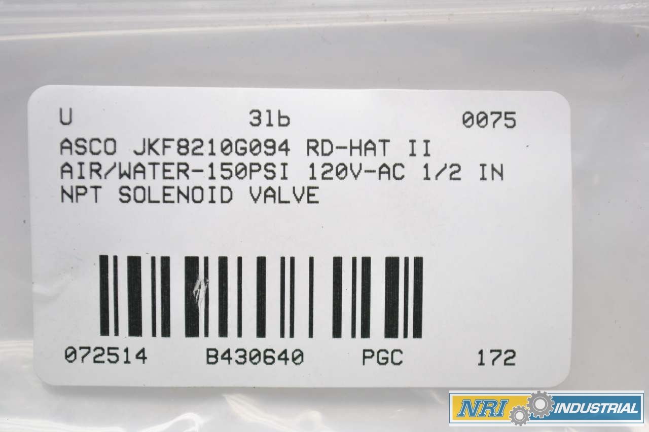 | snippet | ASCO JKF8210G094 RD-HAT II 120V-AC 150PSI 1/2 IN SOLENOID VALVE B430640 |