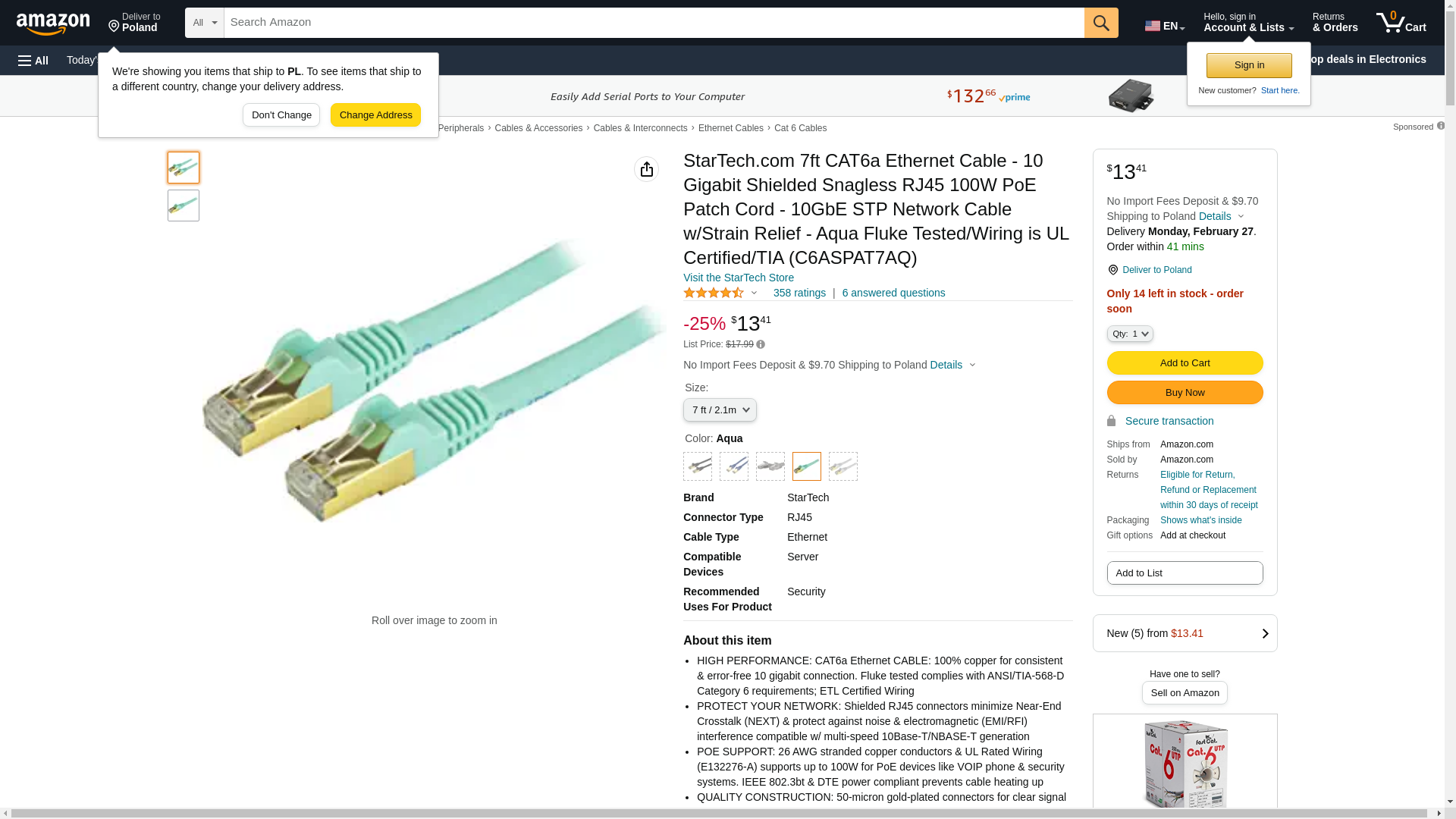 StarTech.com 7ft CAT6a Ethernet Cable - 10 Gigabit Shielded Snagless RJ45 100W PoE Patch Cord - 10GbE STP Network Cable w/Strain Relief - Aqua Fluke Tested/Wiring is UL Certified/TIA (C6ASPAT7AQ)
