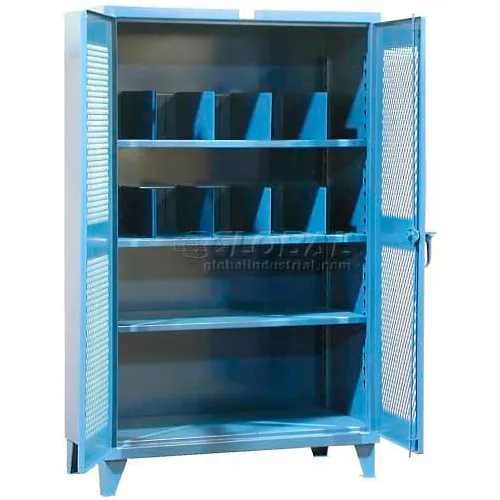 Perfect for inventory control, STRONG HOLD Ventilated Divider Cabinets give you safe, organized storage of heavy parts, tools, and equipment. Storage cabinet includes (2) slotted shelves with (3) adjustable dividers and (1) smooth flat shelf for larger items. All shelves adjust to fit your needs. Doors have diamond perforations for quick inventory of contents and lock securely with a padlock handle with 3-point lock. Strong 12-gauge all-welded steel construction. Welded 7-gauge 6"H legs. Overall height includes 6"H legs. Medium gray, light gray and blue cabinets are custom-made and not returnable.
