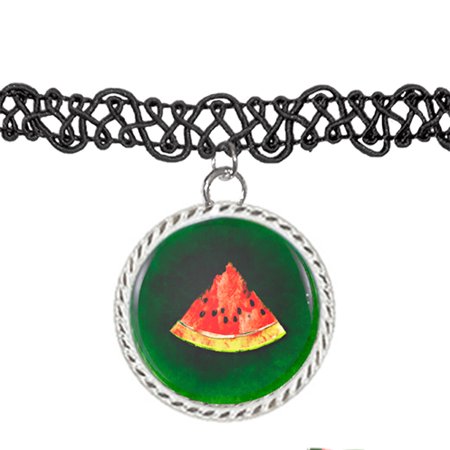 Illustration of a Slice of Watermelon Choker Pendant Charm Necklace. The image is displayed under photo-optic quality acrylic for a perfectly clear glossy image that is also protected from wear and tear. This listing is for choker necklace with charm pendant as pictured. The pendant is made of nickel coated brass and is approximately 7/8 inches (23mm) in diameter and weighs approximately 0.14 ounces (4 grams). The choker is black fabric and is approximately 12 inches long plus a 2 inch extension chain. 100% hand crafted in the USA. All items are 100% hand crafted in the USA at time of purchase. SKU #34813