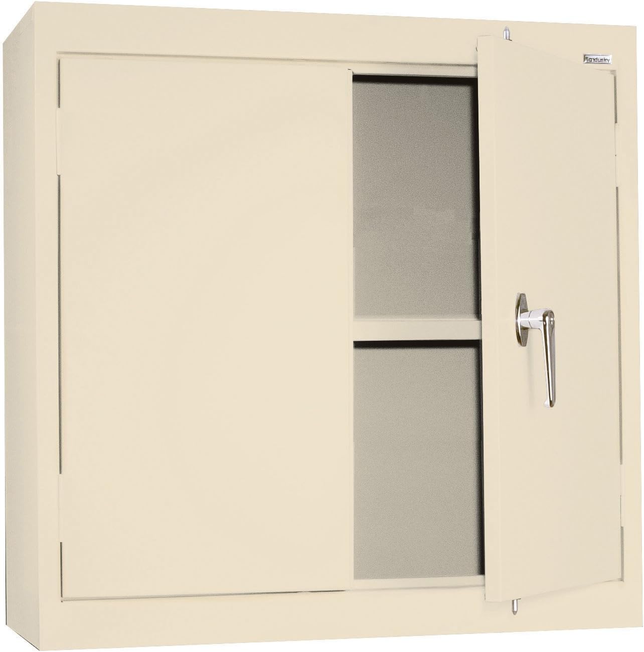 Wall Cabinet Solid Doors - Putty. Solid door wall cabinet. Fully adjustable shelves on 2-Inch center plus raised bottom shelf. Three point door locking system with key. Meets ANSI / BIFMA shelf standards. Handles require some assembly.