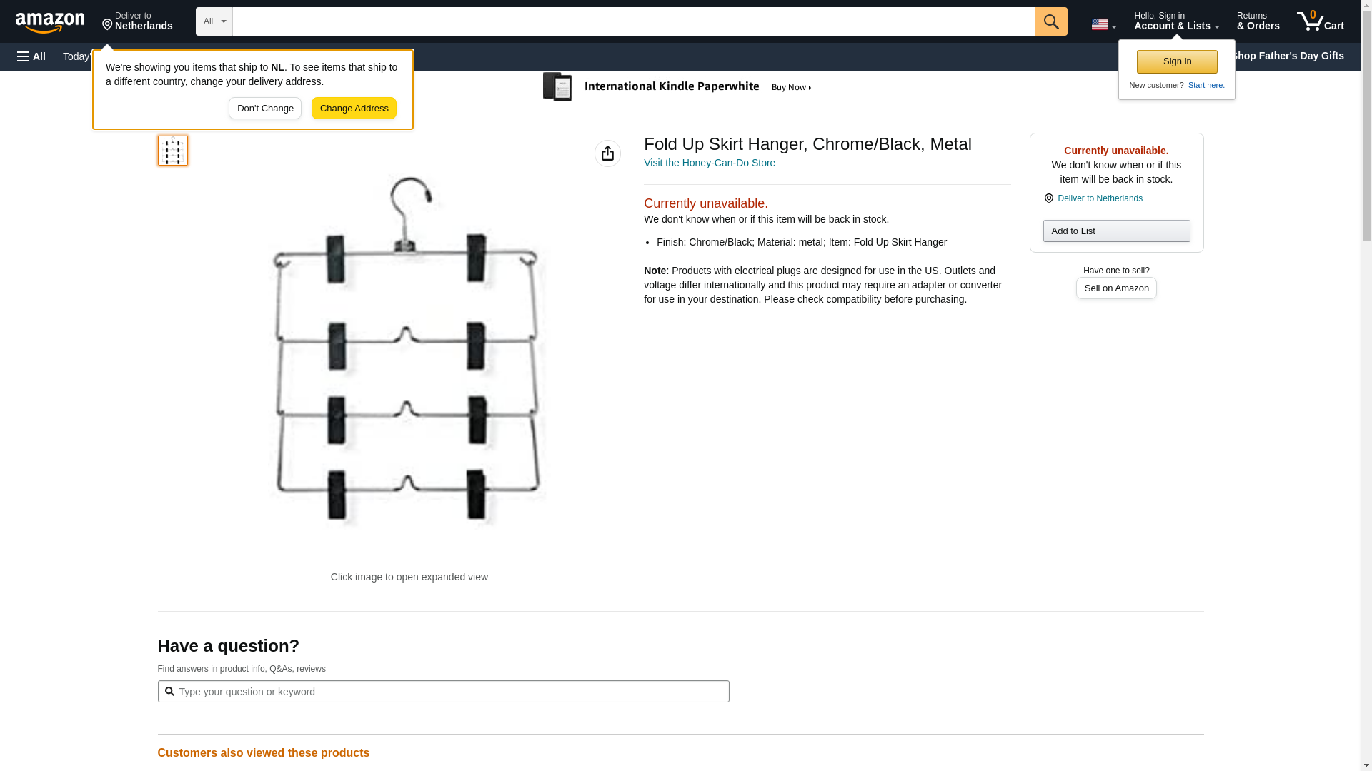 | Feature | Price For: Each Item: Fold Up Skirt Hanger Finish: Chrome/Black Material: Metal Country of Origin (subject to change): China |