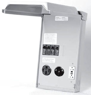 The U075CTL010 is a 120/240V, 20A GFCI + 30A + 50A, 80A outdoor power outlet with breakers This power outlet has a NEMA 3R raintight enclosure. The cover design allows usage of the cord even when the door is closed. Hub provision is provided, and the door is lockable.