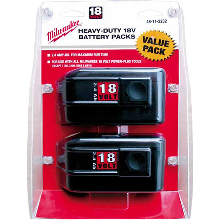 Part Number: 045242087792 <br> Part: Milwaukee 48-11-2232 18V 2.4 Ah Capacity Battery - 2-Pk <br> (2) 18V, Batteries, NiCd, Average Capacity: 2.4 Ah <br> Volts DC: 18 <br> Type: NiCd Battery <br> Also known as: 045242087792, lithium, redlithium, battery, 18v, extended battery, MIL48112232, Milwaukee, 48-11-2232, 18 Volt Batteries & Chargers, Cordless Tool - Batteries & Chargers, Cordless Tools, Tools, Testing, Meters <br> Equivalent to: <ul></ul>