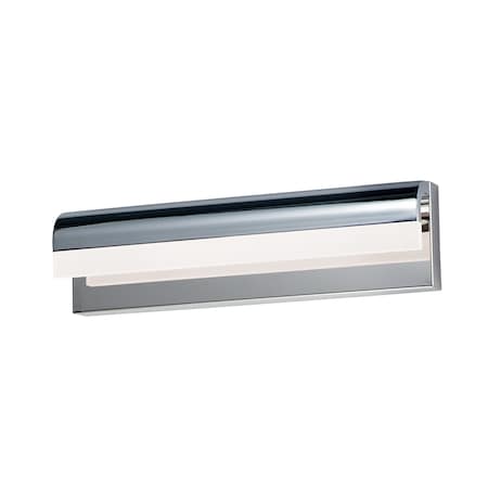 An aluminum frame of Polished Chrome or Black, cascades downward and supports a frosted acrylic diffuser which nicely diffuses the light from the LED enclosed. A perfect complement to the similar bath hardware found in many homes today.<br>LED Bath Vanity<br>Collection: Waterfall<br>Finish: Polished Chrome<br>Width: 18"<br>Height: 4.75"<br>Safety Listing: Damp<br>Bulbs: 1 X PCB 13W 910lm, Included