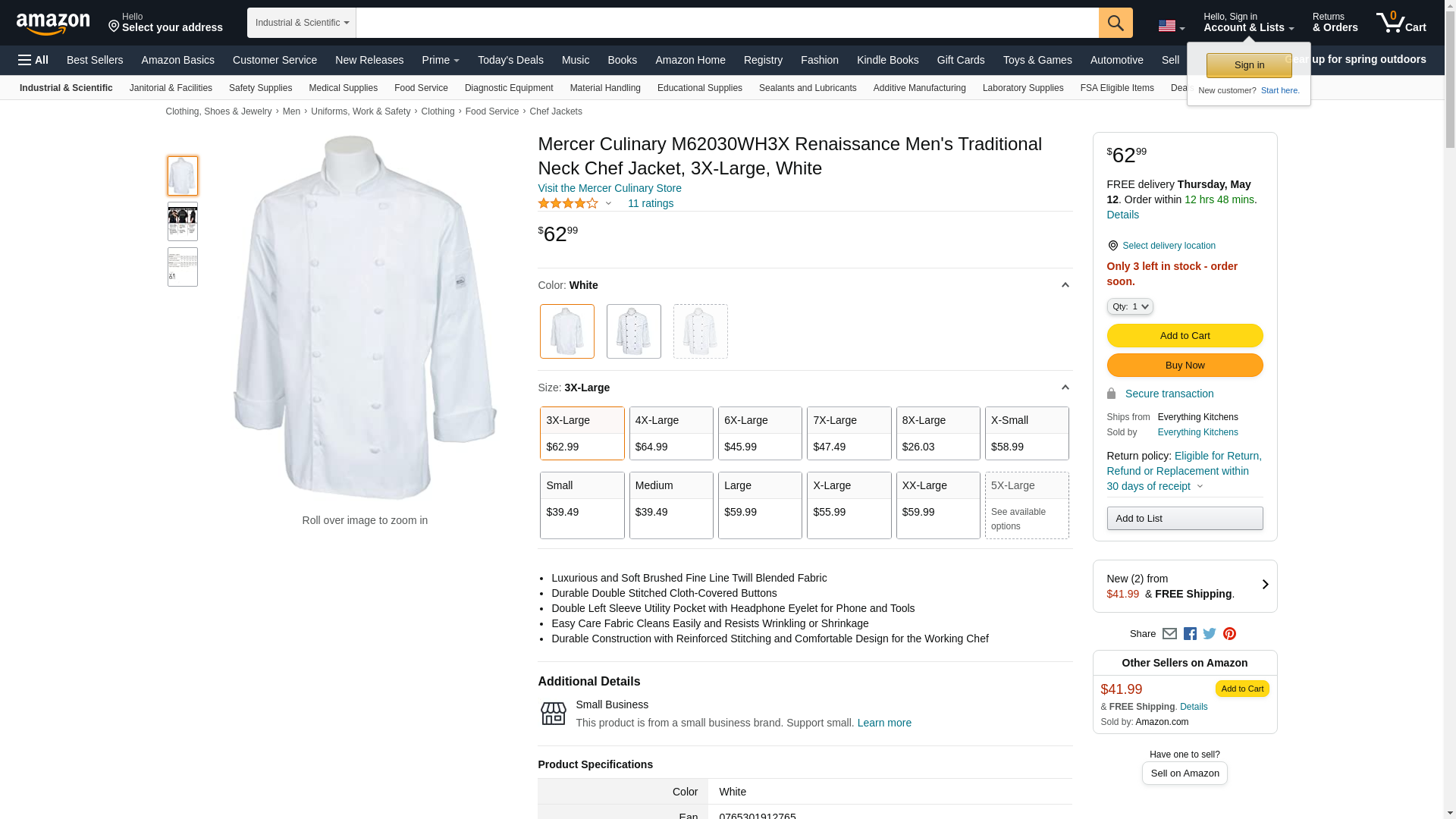 Mercer Culinary M62030WH3X Renaissance Men's Traditional Neck Chef Jacket, 3X-Large, White