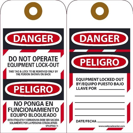 - Tag Legend: the front side legend reads DANGER - DO NOT OPERATE - THIS TAG & LOCK TO BE REMOVED ONLY BY THE PERSON SHOWN ON BACK. The back-side legend is DANGER - EQUIPMENT LOCKED OUT BY. The legends are printed in both English and Spanish
