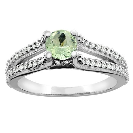 10K White Gold Natural Green Amethyst Engagement Split Shank Ring Round 5mm Diamond Accents, sizes 5 - 10