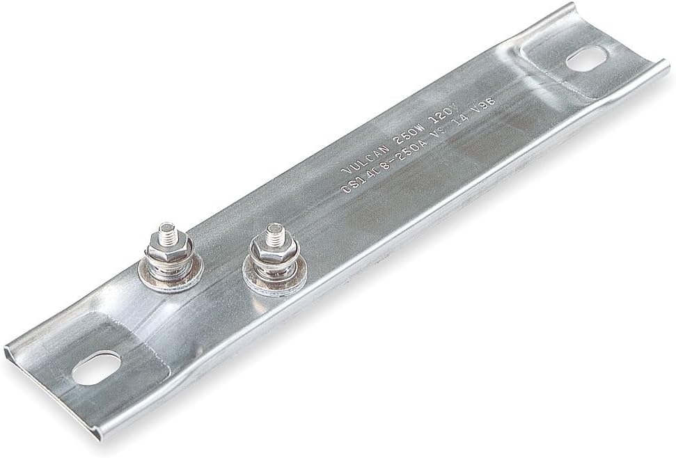 Stainless Steel Strip Heaters 5/16H x 1-1/2W 5/16W x 1/2L slotted holes on each end 10-32 screw terminals (screw and nut terminals on Vulcan units) Sheath temp.: 1200°F max. Great for applications requiring low-profile designs. UL Recognized. This listing is for each. Technical Specification Item Strip Heater Heater Voltage 240V AC Terminals Offset Overall Length 42 1/2 in Mounting Dimension 41 1/2 in Watts 1, 500 W Watt Density 13W/sq in Sheath Material Stainless Steel Material Stainless Steel Mounting Type Surface Mount Slotted Hole Length 1/2 in Slotted Hole Width 5/16 in Phase 1 Max. Sheath Temp. 1, 200 Degrees F Screw Size 10-32 Standards UL Recognized Includes Mounting Tabs