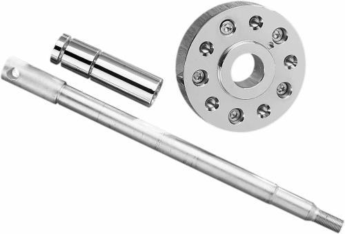 Original Randy Smith design.<br> Allow the use of narrow glide 19in. or 21in. wheel (found on FX, FXR, FXD and XL models) to be installed in a 41mm Wide Glide front end.<br> Include aluminum disc spacer (second spacer for dual disc available), socket head screws, axle spacer and 3/4 axle.<br> Spacer and axle are cadmium plated; disc spacer is chrome plated.<br> Made in the USA.<br> For 84-99 Narrow Glide models