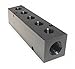 | Feature | <b>Price For:</b> Each <b>Max. Pressure</b>: 1000 psi <b>Number of Inlets</b>: 2 <b>Body Material</b>: Black Anodized Aluminum <b>Item</b>: Manifold <b>Connection Type</b>: NPT <b>Temp. Range</b>: -10 Degrees to 200 Degrees F <b>Inlet Size</b>: 3/8" <b>Outlet Size</b>: 1/4" <b>Overall Length</b>: 4-3/4" <b>Overall Height</b>: 1-1/4" <b>Mounting Hole Size</b>: 0.20" <b>Number of Outlets</b>: 5 <b>Overall Width</b>: 1-1/4" |