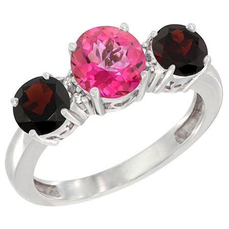 14K White Gold Round 3-Stone Natural Pink Topaz Ring & Garnet Sides Diamond Accent, sizes 5 - 10