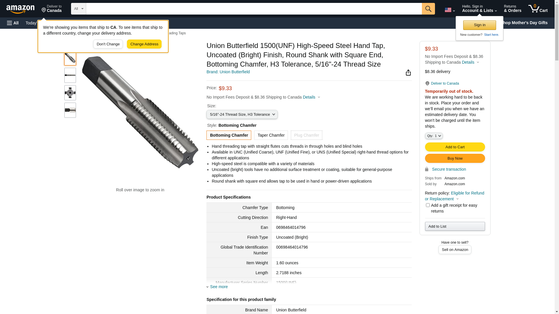 Union Butterfield 1500(UNF) High-Speed Steel Hand Tap, Uncoated (Bright) Finish, Round Shank with Square End, Plug Chamfer, H3 Tolerance, 5/16"-24 Thread Size