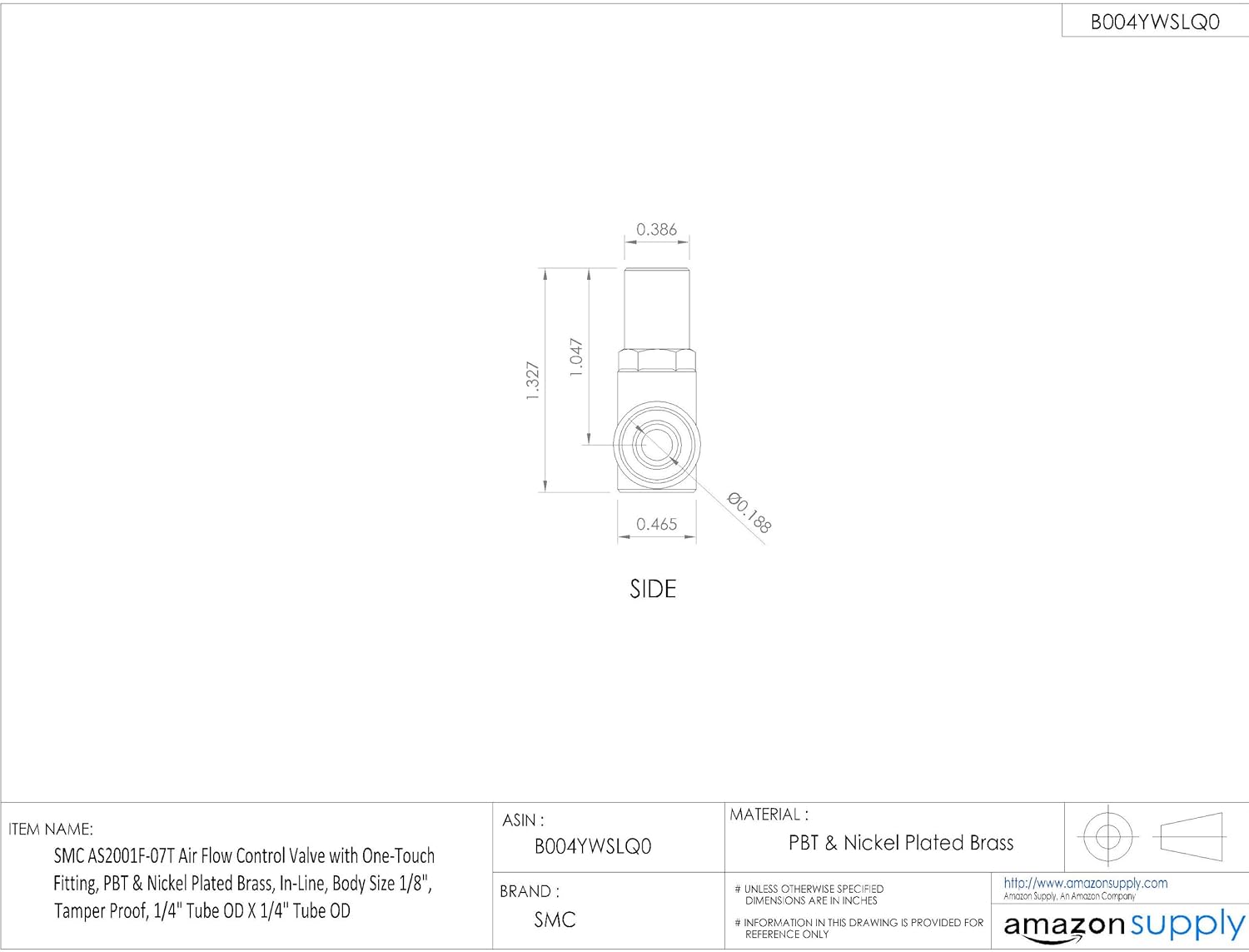 SMC AS2001F-07T Air Flow Control Valve with Push-to-Connect Fitting, PBT & Nickel Plated Brass, In-Line, Body Size 1/8", Tamper Proof, 1/4" Tube OD x 1/4" Tube OD