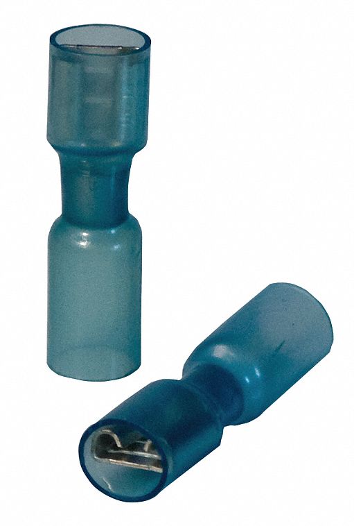 - <b>Price For:</b> Each <b>Connection Type</b>: Crimp <b>Insulation</b>: Full <b>Max. Voltage</b>: 600V <b>Seam</b>: Brazed <b>Connection Material</b>: Tin-Plated Copper <b>Standards</b>: cRUus, ELV Compliant, RoHS Compliant <b>Insulation Color</b>: Blue <b>Barrel Inside Dia.</b>: 0.080" <b>Tab Size</b>: 0.032" x 0.250" <b>Wire Range</b>: 16 to 14 AWG <b>Overall Length</b>: 1.260" <b>Insulation Type</b>: Heat Shrink <b>Max. Temp.</b>: 257 Degrees F