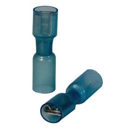 'Female Disconnect, Insulation Full, Insulation Type Heat Shrink, Insulation Color Blue, Wire Range 16 to 14 AWG, Tab Size 0.032 In. x 0.250 In., Barrel Inside Dia. 0.080 In., Max. Temp. 257 Degrees F, Max. Voltage 600V, Overall Length 1.260 In., Seam Brazed, Connection Material Tin-Plated Copper, Standards cRUus, ELV Compliant, RoHS Compliant, Connection Type Crimp, Package Quantity 25'