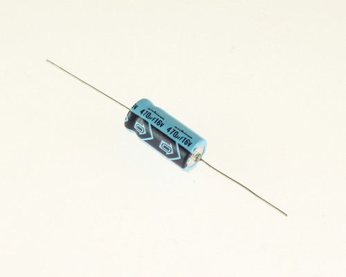 NICHICON capacitor: P/N TLB1C471TCAA; capacitance = 470 uF, voltage = 16 VDC, tolerance = 20%, temperature = 85, lead length = 27.94 mm (1.100 in), lead type = axial; (item ID: 2020069774)