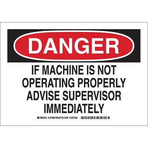 Brady 127879 DANGER If Machine Is Not Operating Properly Advise Supervisor Immediately Sign - Light Duty Plastic - Black/Red on White - 7 x 10