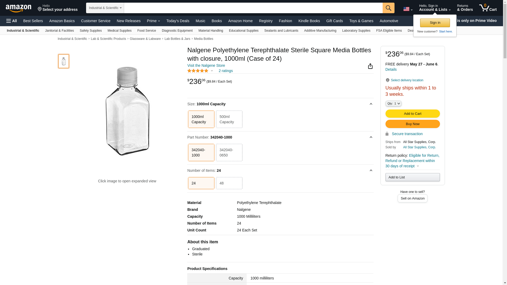 Nalgene Polyethylene Terephthalate Sterile Square Media Bottles with closure, 1000ml (Case of 24)