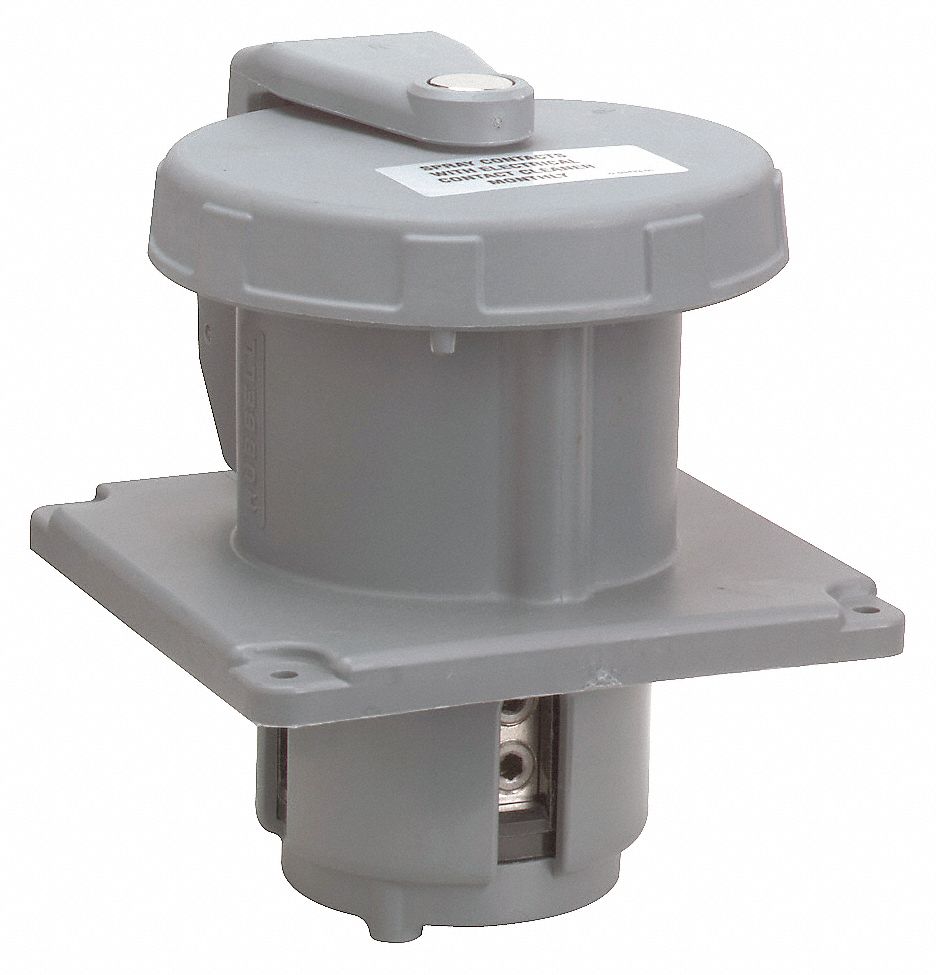 'Pin and Sleeve Inlet, Color Gray, Amps 100, Number of Poles 3, Number of Wires 4, Phase 3, Voltage 125/250VAC, Features Abuse Resistant, Body Material Nylon, Standards UL Listed, CSA Certified'