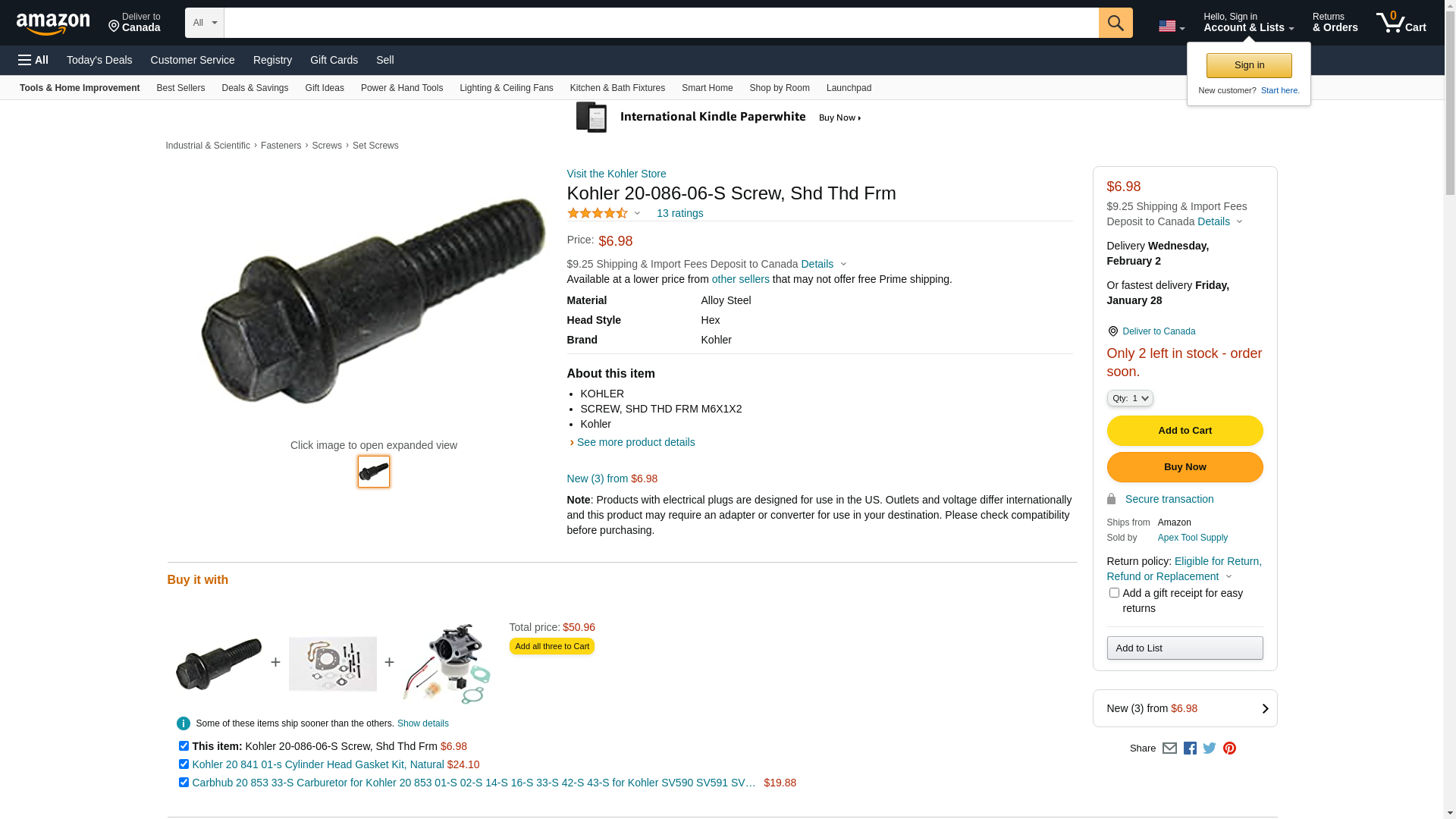 Kohler 20-086-06-S Screw, Shd Thd Frm