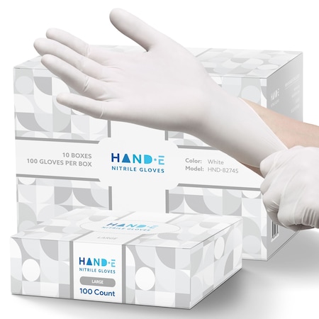 - SLEEK AND STYLISH: Not only are the gloves a beautiful clean white, Hand-E boxes have an elegant design you'll love to leave on your kitchen counter, office desk, or workstation. There are 10 boxes in this case, with 100 gloves per box. The boxes fit in any standard size glove dispensers. Also available in pink, black, and blue.