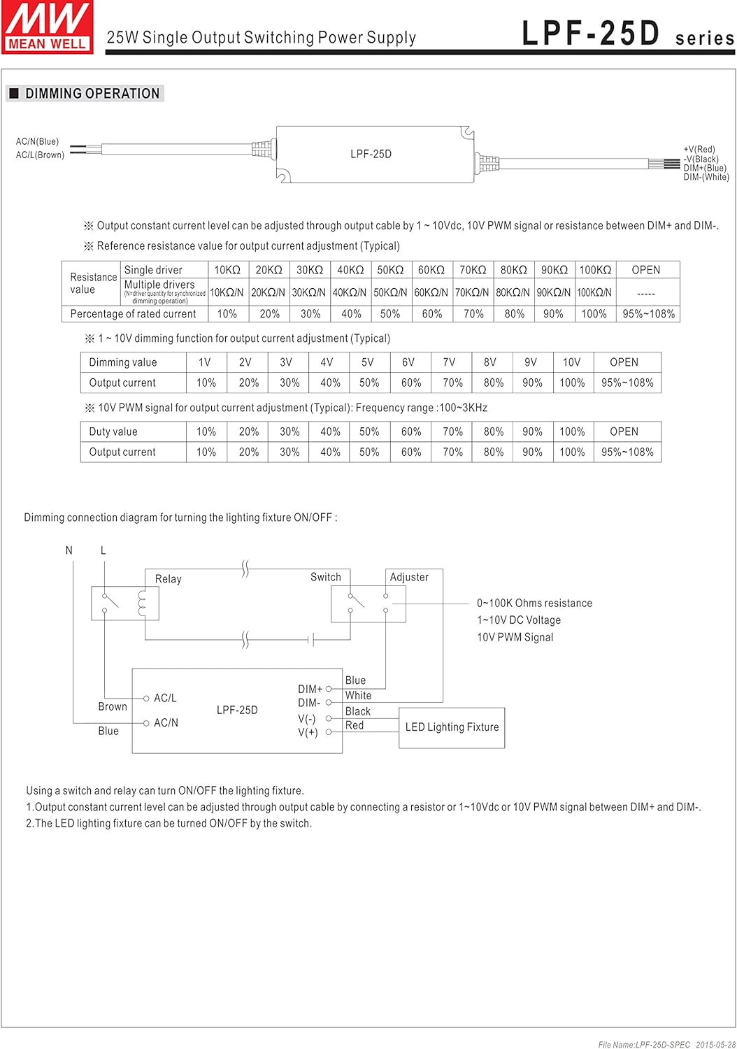 LPF-25D series is a 25W AC/DC LED driver featuring the dual modes constant voltage and constant current output.LPF-25D operates from 90¡«305VAC and offers models with different rated voltage ranging between 12V and 54V.Thanks to the efficiency up to 86%,with the fanless design,the entire series is able to operatefor -35¡ãC~+70¡ãC case temperature under free air convection.LPF-25D is equipped with the 3 in 1 dimming function so as to provide the design flexibility for LED lighting system.Features: Constant Current mode output | Plastic housing with Class II design | Built-in active PFC function | Class 2 power unit | Fully encapsulated with IP67 level | Function:3 in 1 dimming | Typical lifetime>50000hours | 5 years warranty