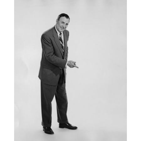 Studio portrait of businessman pointing downwards Poster Print