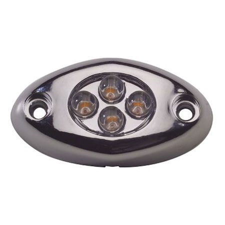 4-LED Courtesy Light - Surface Mount Operates 9-16 volt DC systems 24 volt version available Rated @ 100,000 hours of service life Shock and vibration proof Cool to the touch Energy draw 30-65 milliamps No corrosion Potted to seal out moisture 4 LEDs 1.57 x .82 x .57 LED Color: White Case Color: Chrome