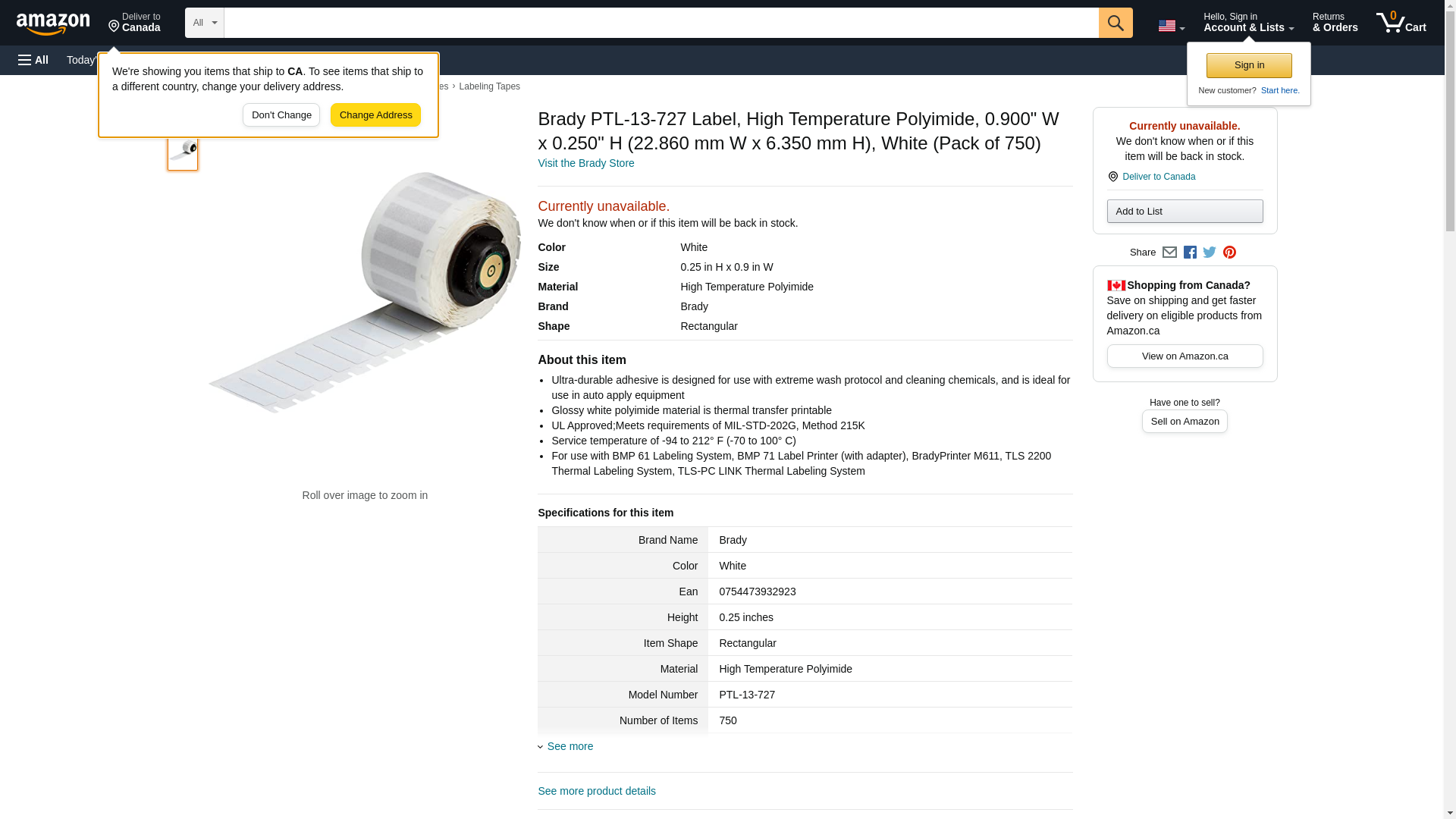 Brady PTL-13-727 Label, High Temperature Polyimide, 0.900" W x 0.250" H (22.860 mm W x 6.350 mm H), White (Pack of 750)