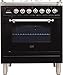 Ilve UPN76DMPNXLP Nostalgie Series 30 Inch Dual Fuel Convection Freestanding Range, 5 Sealed Brass Burners, 3 cu.ft. Total Oven Capacity in Glossy Black, Chrome Trim (Liquid Propane)