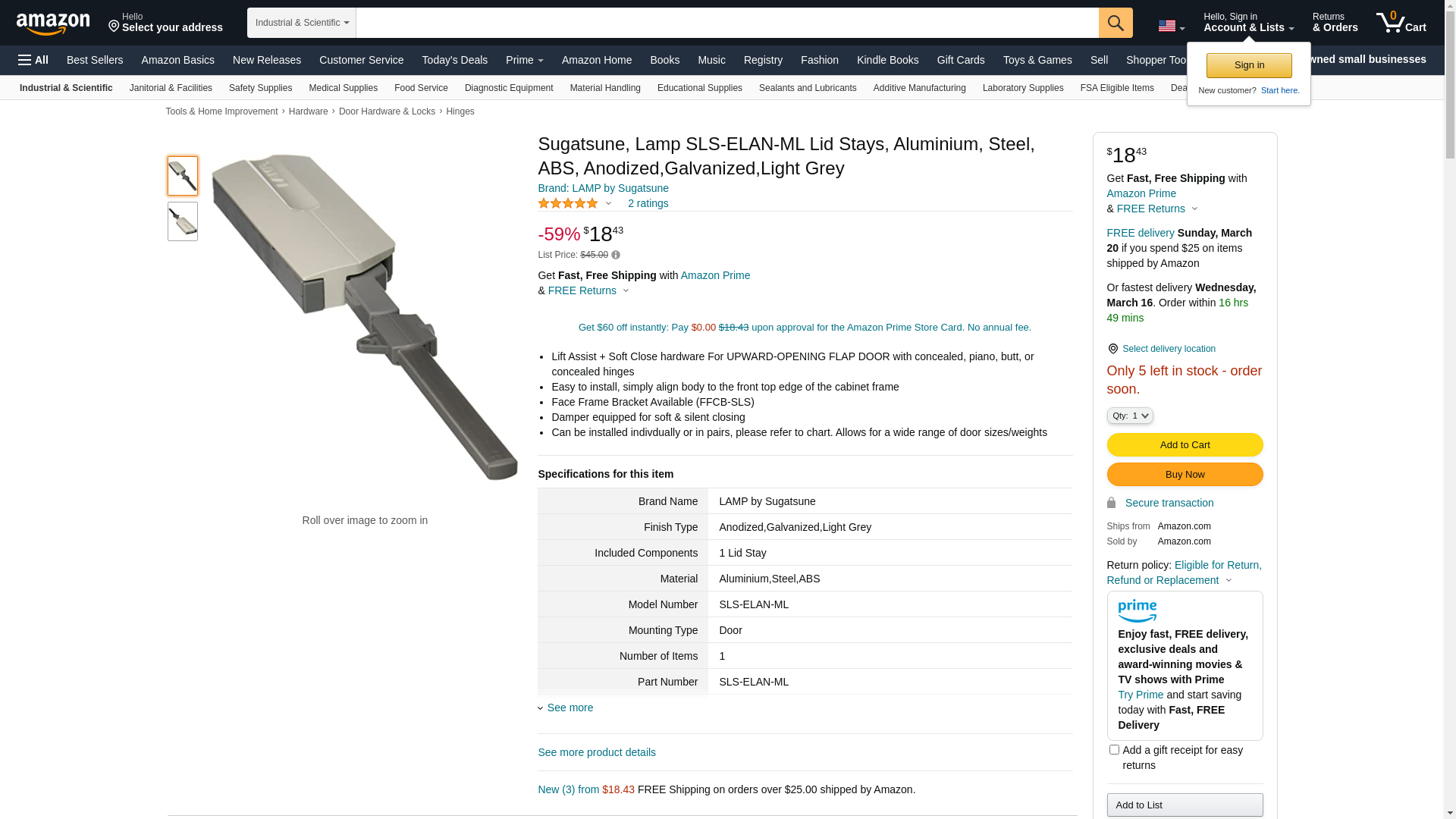 Sugatsune, Lamp SLS-ELAN-ML Lid Stays, Aluminium, Steel, ABS, Anodized,Galvanized,Light Grey