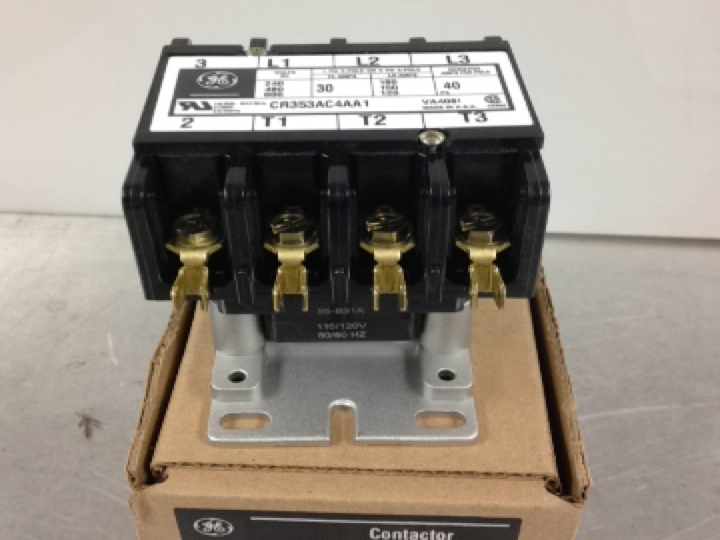 GE CR353 Series 4-Pole 3-Phase Full voltage definite purpose contactor has coil voltage rating of 110 - 120 Volts at 50/60 Hz. Contactor has voltage rating of 120 Volts, current rating of 30 Amps at inductive load and 40 Amps at resistive load. It has screw with quick-connect line and load terminal connection. Contactor has locked rotor rating of 150 Amps at 240 Volts, 125 Amps at 480 Volts and 100 Amps at 600 Volts. It measures 3.3 Inch x 3.75 Inch. It is suitable for electrical distribution an